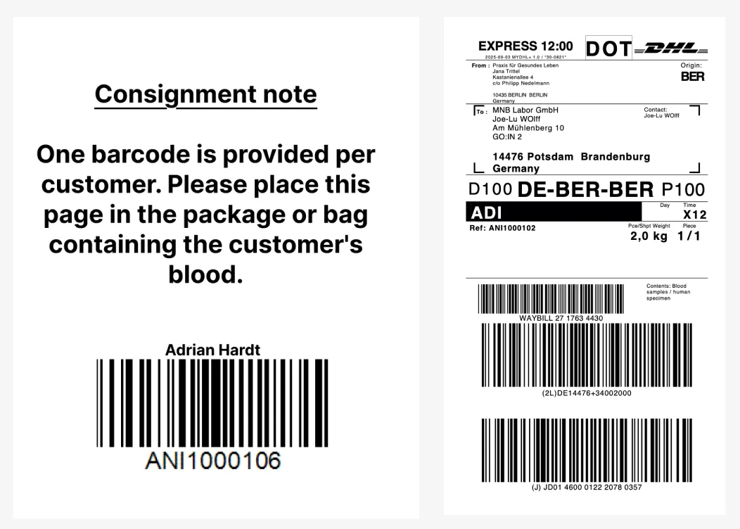 Consignment note (put into the package together with the blood tubes so that the laboratory can identify and connect the blood to the correct customer) and shipping label (stick on the package). This is how it looks like: